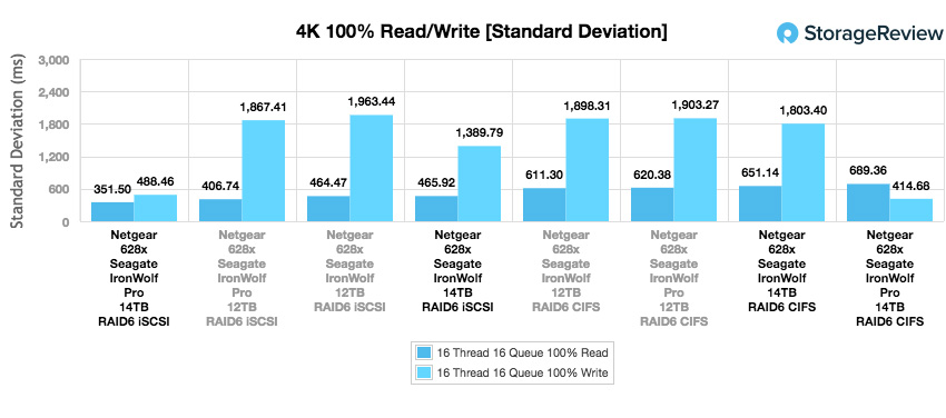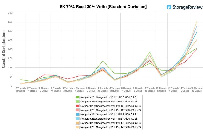 L’écart-type pour 8k 70/30 indiquait le 14 To Pro avec 19,3 ms à 658,46 ms dans iSCSI, tandis que CIFS enregistrait un solide de 23,54 ms à 470,66 ms.