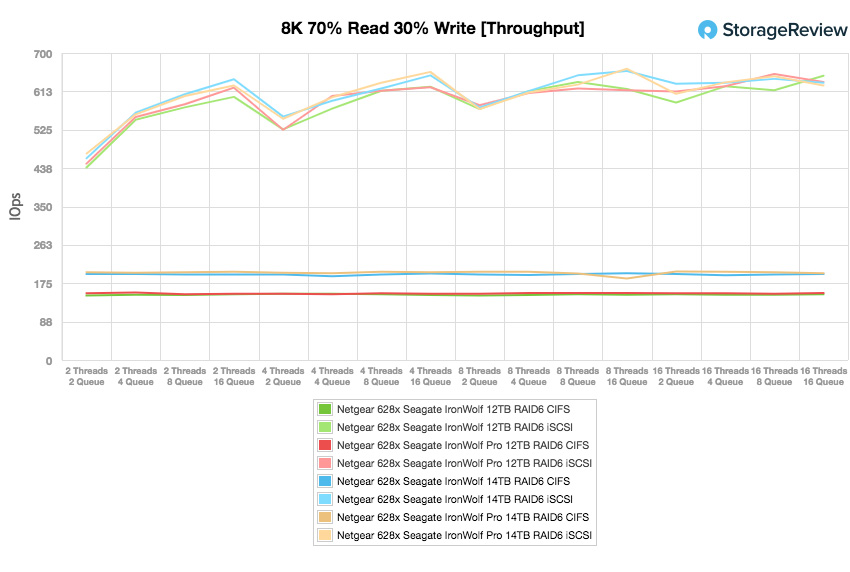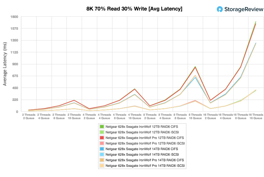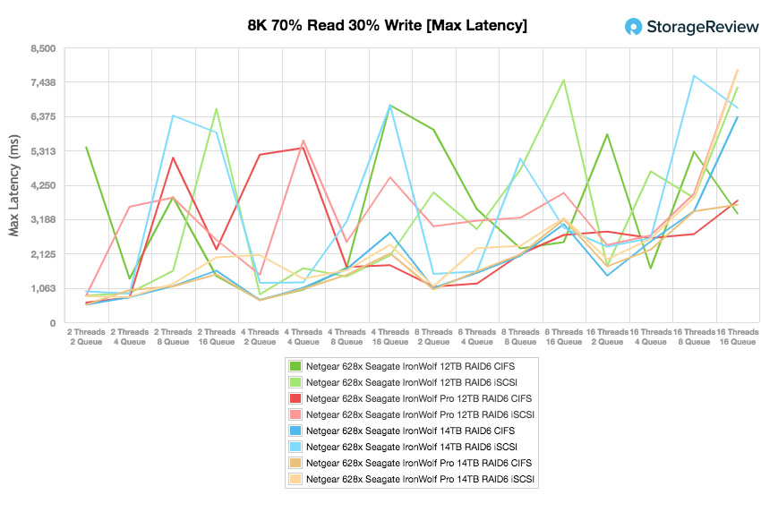 Notre prochain test passe d’un scénario séquentiel pur 100% en lecture / écriture séquentiel 8k à une charge de travail mixte 8k 70/30, dans laquelle nous montrerons comment les performances évoluent d’un paramètre de 2T / 2Q à 16T / 16Q. Le lecteur IronWolf 14 To affichait des performances similaires en iSCSI tout au long du test, mais il a chuté à la fin avec 626 IOPS dans les profondeurs de la file d’attente du terminal iSCSI.