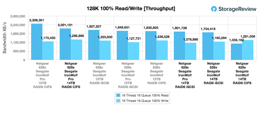Notre dernier test est le benchmark 128k, qui est un test séquentiel en gros blocs qui montre la vitesse de transfert séquentiel la plus élevée. Le Seagate IronWolf Pro 14 To a dépassé de loin le modèle de capacité inférieure en termes de performances de lecture CIFS, affichant 2 Go / s contre 2,31 Go / s pour les 12 To. En écriture, le modèle 14TB affichait une avance de 1,3 Go / s. Dans iSCSI, le disque IronWolf Pro de 14 To a atteint 1,8 Go / s en lecture et 1,08 Go / s en écriture, ce qui est à nouveau inférieur au modèle plus ancien et plus petit.