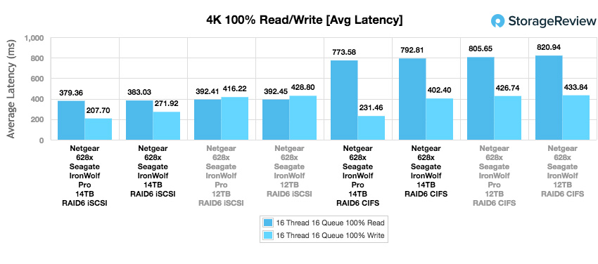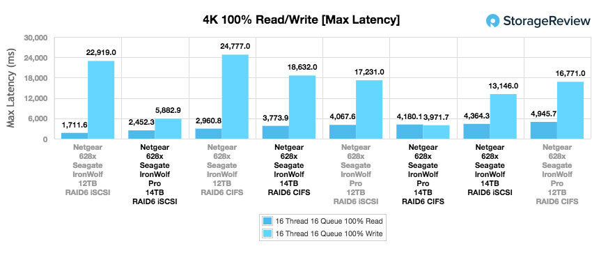 En regardant la latence maximale de 4 k, nous voyons que l’IronWolf Pro avait une vitesse de lecture de 2 452,3 ms en iSCSI et de 4 180,1 ms en CIFS. Les performances en écriture étaient globalement meilleures avec iSCSI à 5 882,9 ms et CIFS à 3 971,7 ms.