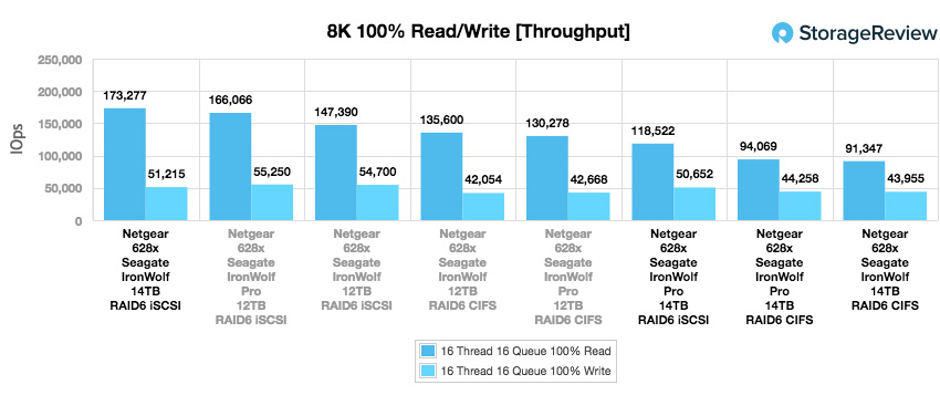 Le test d’évaluation suivant teste les lecteurs dont l’activité en lecture / écriture est inférieure à 100%, mais cette fois à un débit séquentiel de 8 000 kHz. Le Seagate IronWolf Pro 14 To Pro a été nettement surperformé par le modèle non Pro en lecture iSCSI avec 118 522 IOPS. Il a publié une écriture beaucoup plus proche de 50 652 IOPS.
