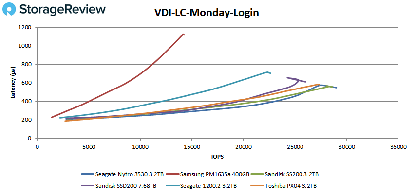 Enfin, VDI LC Monday Login a permis au disque d’atteindre des performances maximales de 29 015 IOPS et une latence de 547,5 ms.