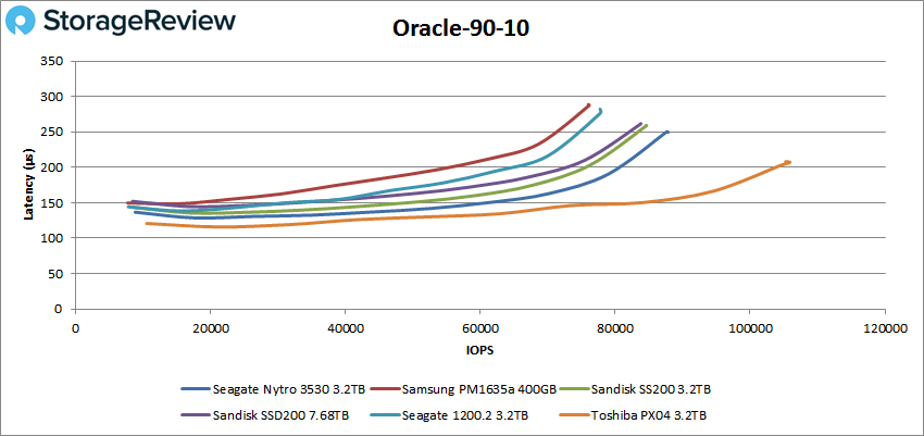 Dans Oracle 90-10, le disque Seagate affichait des performances maximales de 87 831 IOPS avec une latence de 250 µs.