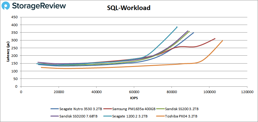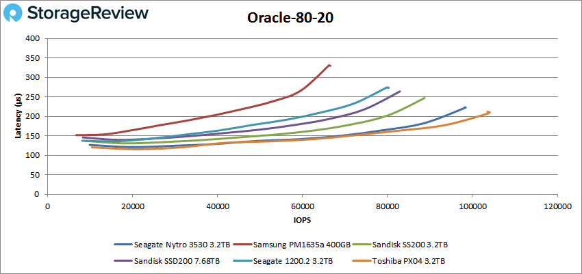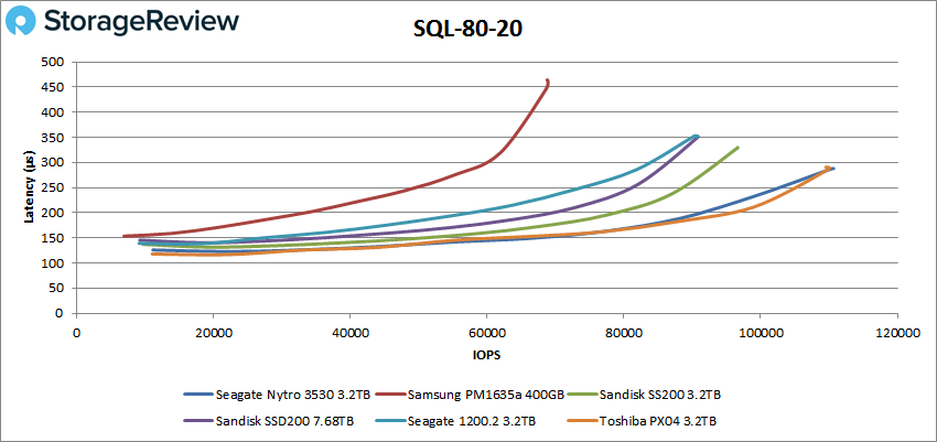 En SQL 80-20, le Nytro 3530 a culminé à 110 649 IOPS et à une latence de 288,1 µs.