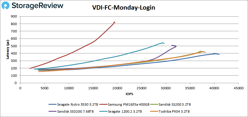 Pour le VDI FC Monday Login, le disque Seagate Nytro a culminé à 40 994 IOPS avec une latence de 388 ms.