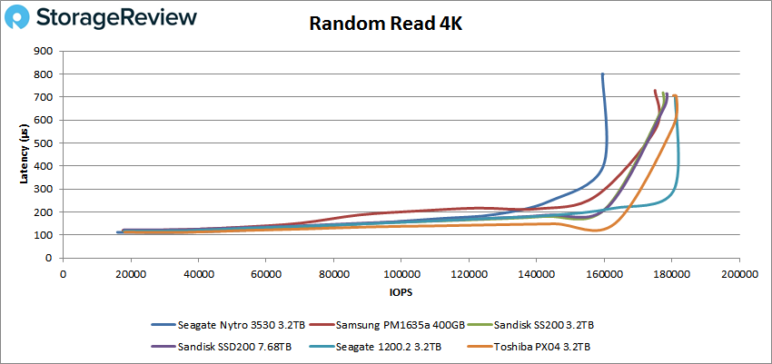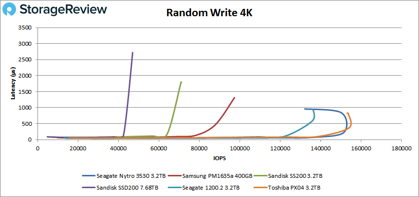 Dans notre première analyse de la charge de travail VDBench, Random 4K Read, le Nytro 3530 affichait une latence inférieure à la milliseconde tout au long du test, tout comme les autres disques, avec un pic à 159 720 IOPS avec un temps de latence de 799,1 ms.