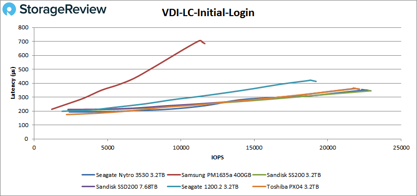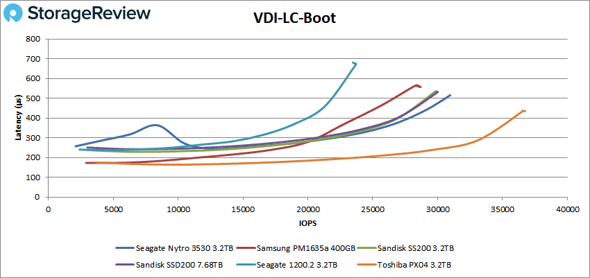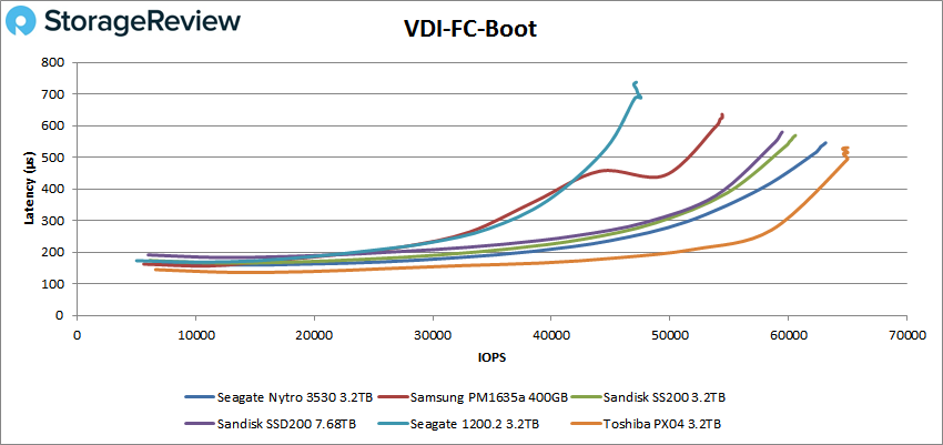 Ensuite, nous passons à notre test de clonage VDI, Full and Linked. Pour le VDI Full Clone Boot, le Seagate Nytro 3530 a montré des performances maximales de 63 143 IOPS avec une latence de 546 ms, tout en maintenant une latence inférieure à la milliseconde tout au long du test (ainsi que pour les tests ci-dessous).