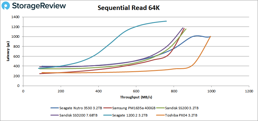 Passant aux charges de travail séquentielles, nous examinons d’abord notre test de lecture de 64 Ko. Dans cette charge de mots, le Nytro 3530 avait une latence inférieure à la milliseconde pendant la grande majorité du test, atteignant un maximum de 995,2 Mo / s (soit 15 293 IOPS) avec une latence de 1002,8 ms.