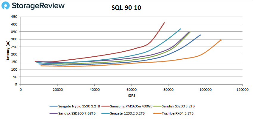 En ce qui concerne SQL 90-10, le disque Seagate a poursuivi sa solide performance avec un pic de 97 433 IOPS avec une latence de 327,5 µs.